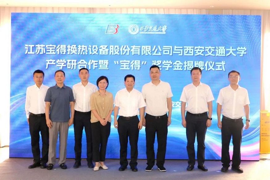 8月18日下午,江蘇寶得換熱設(shè)備股份有限公司與西安交通大學(xué)簽署產(chǎn)學(xué)研合作協(xié)議及“寶得”獎學(xué)金揭牌儀式在江陰成功舉行。